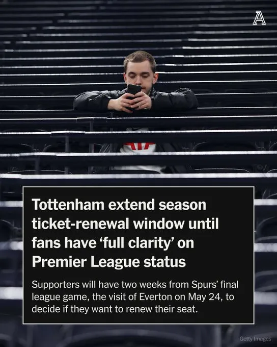 虎扑03月12日讯 托特纳姆热刺已将2026-27赛季球迷季票续费窗口期延长至6月7日,原因是球队跌入英冠联赛的降级风险持续加剧。